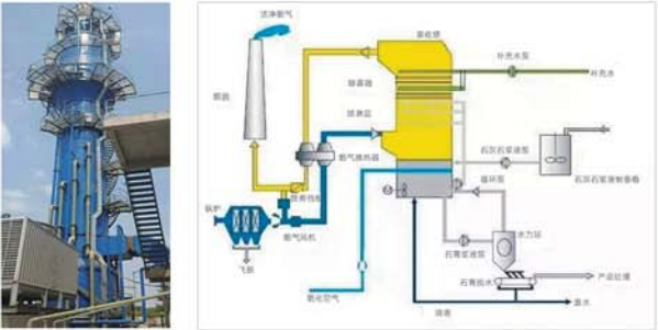 煙氣進入脫硫裝置的濕式吸收塔,與自上而下噴淋的堿性石灰石漿液霧滴逆流接觸,其中的酸性氧化物SO,以及其他污染物HCL、HF等被吸收,煙氣得以充分凈化;吸收SO,后的漿液反應生成CaSO,,通過就地強制氧化、結晶生成 CaSO·2H,O,經脫水后得到商品級脫硫副產品一石膏,最終實現含硫煙氣的綜合治理。