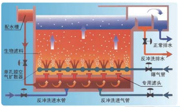 曝氣生物濾池(Biological Aerated Filter簡稱BAF)是上世紀八十年代末法國研制成功的污水處理新工藝,屬第三代生物膜反應器,不僅具有生物膜工藝技術的優勢,同時也起著有效的空間過濾作用。其基本原理是在一級處理基礎上,以顆粒狀填料及其附著生長的生物膜為處理介質,充分發揮生物代謝作用、物理過濾作用、膜及膜和填料的物理吸附作用以及反應器內食物多級捕食作用,實現污染物在同一單元反應器內去除。通過使用特殊的濾料和正確的配氣設計,使其與傳統處理工藝相比具有優異的工藝性能。